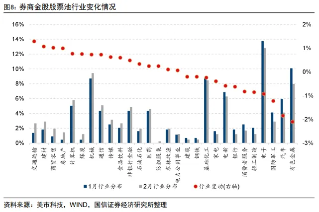 根据我们的统计,截至2026年2月2日,共有41家券商发布本月金股。在对券商金股股票池进行去重后,总共有273只A股。我们对券商金股在中信一级行业上的权重分布及变化情况进行分析,其结果如图8所示。具体来看: