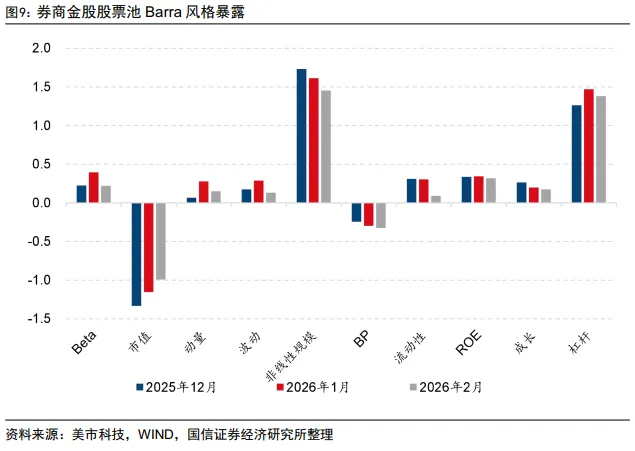 从风格暴露来看,本月券商金股股票池偏向中市值、高估值、强动量风格。