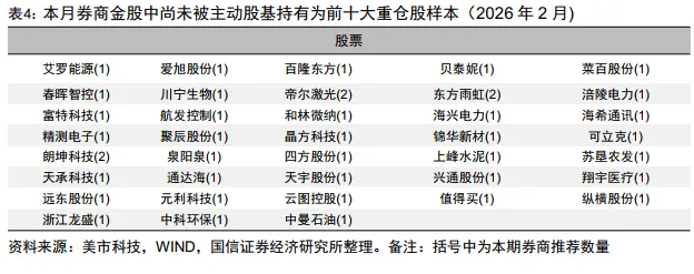 从买方关注度视角来看,如果一只股票尚未被任何一只主动股基持有为前十大重仓股,说明其在公募基金经理这一群体中的关注度有待提升。我们获取本月券商金股股票池中,尚未被任何一只主动股基在最近一个季报中持有为前十大重仓股的样本,其结果如表4所示。
