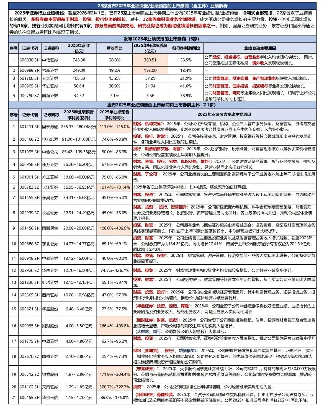 截至2026年2月1日,已有26家上市券商或上市券商主体公布2025年度业绩快报/业绩预告,26家券商净利润全部预增。