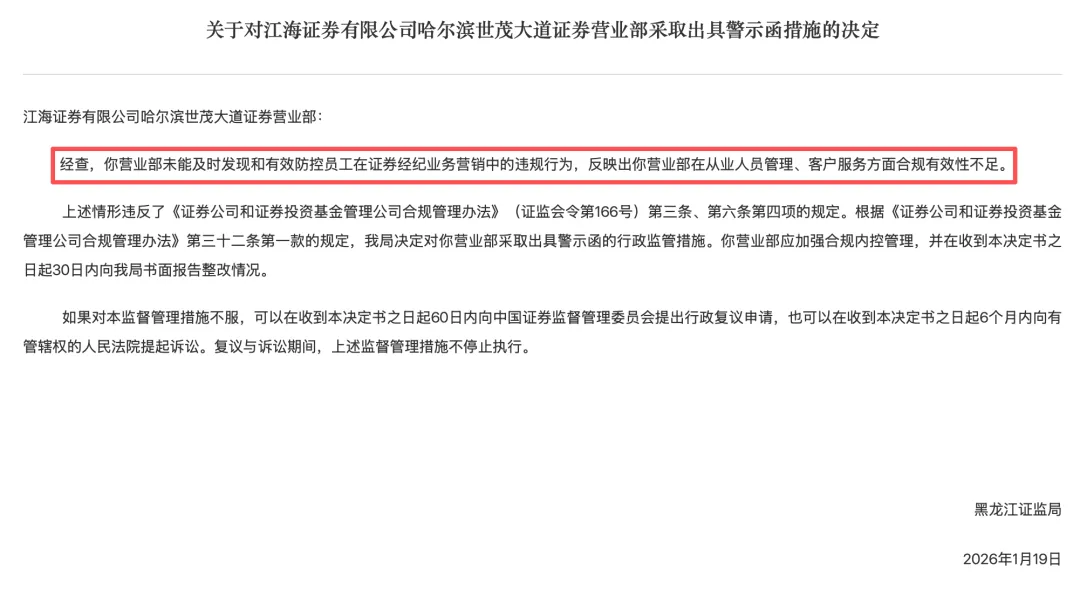 江海证券哈尔滨世茂大道证券营业部未能及时发现和有效防控员工在证券经纪业务营销中的违规行为,反映出营业部在从业人员管理、客户服务方面合规有效性不足。基于此,黑龙江证监局对该营业部采取出具警示函的行政监管措施,并要求收到罚单之日起30日书面报告整改情况。