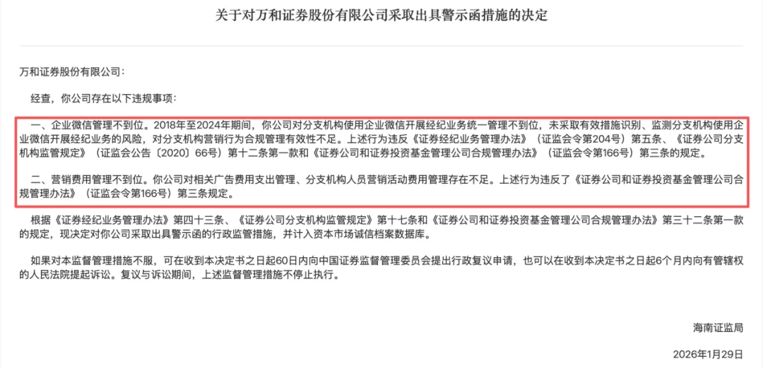 万和证券同样被采取出具警示函的行政监管措施,并计入资本市场诚信档案数据库。万和证券存在两项违规事: