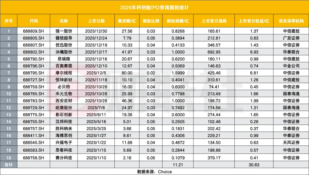 从单个项目看,2025 年科创板上市企业的跟投收益表现亮眼,多家企业上市首日便为保荐券商带来超亿元收益。