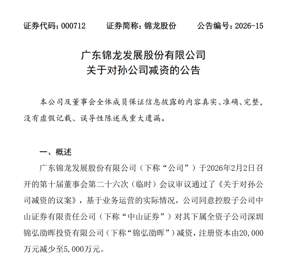 2月2日,锦龙股份密集发布多份公告,披露了副董事长辞职、增补董事、对孙公司减资等多项重要事项。公告显示,锦龙股份同意控股子公司中山证券对其下属全资子公司深圳锦弘劭晖投资有限公司(下称锦弘劭晖)减资,注册资本由2亿元减至5000万元。