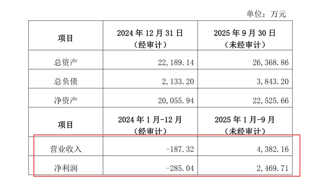 财务数据方面,锦弘劭晖在2024年处于亏损状态,但在2025年前三季度实现了盈利。2024年,公司营业收入为-187.32万元,净利润为-285.04万元。而截至2025年9月30日,公司营业收入达到4382.16万元,净利润为2469.71万元。