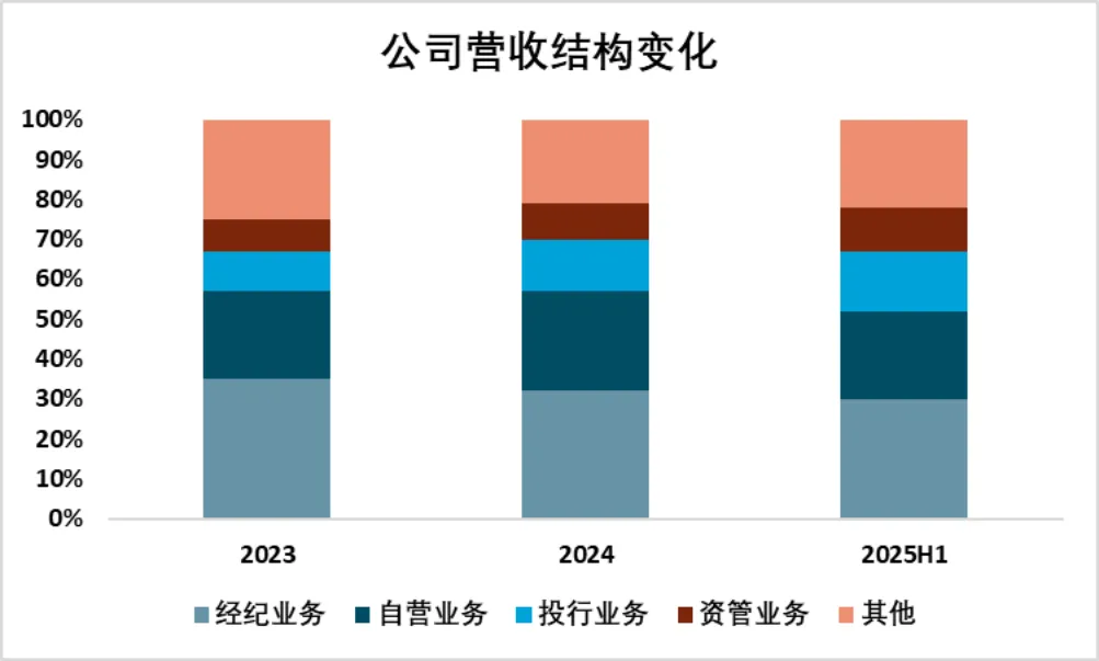 经纪业务仍是公司的业务基石,但收入占比持续下降,由2023年的35%下降至2025H1的30%。自营业务波动较大,反映了市场波动的影响。