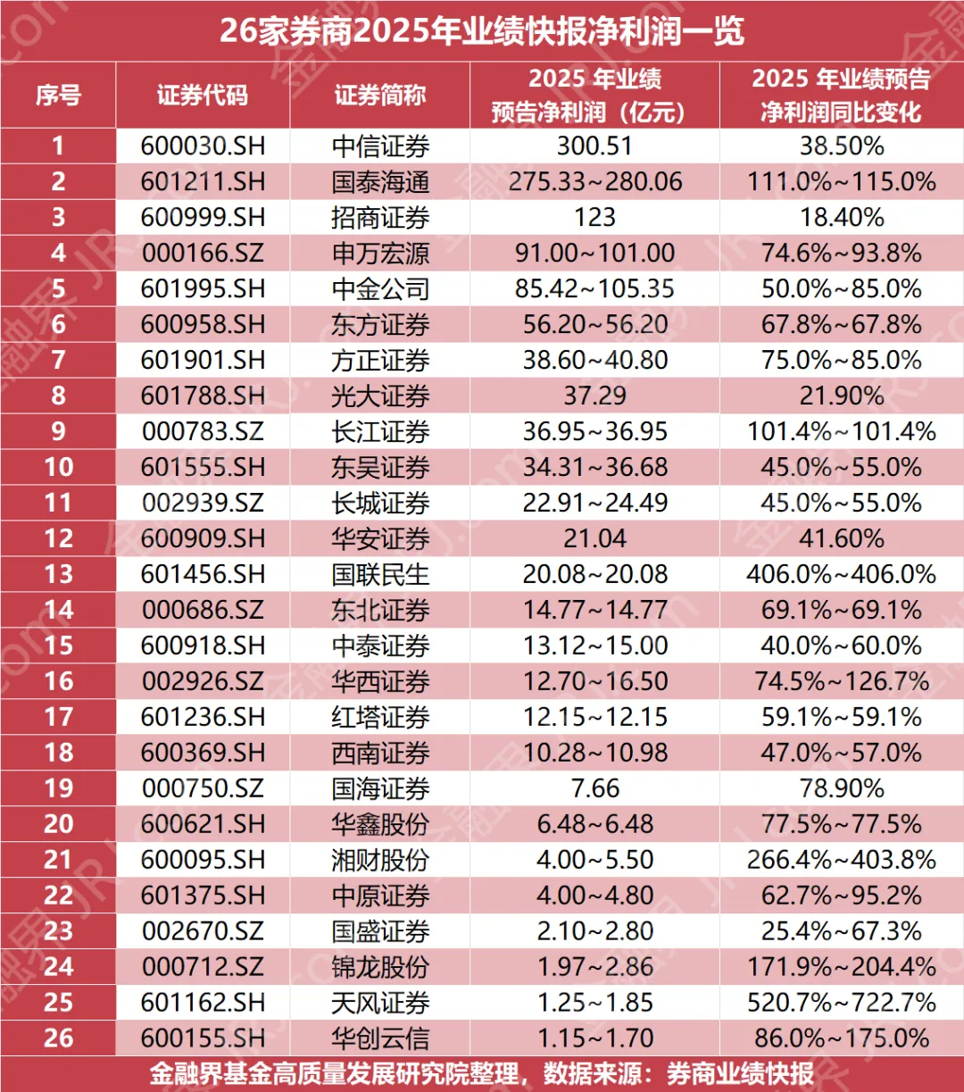 除了巨头们的稳健,一些中小券商凭借差异化打法,展现出了更强的业绩弹性。在这26家里,净利润同比增幅超过100%(按预告上限算)的,足足有8家,算是“翻倍军团”了。