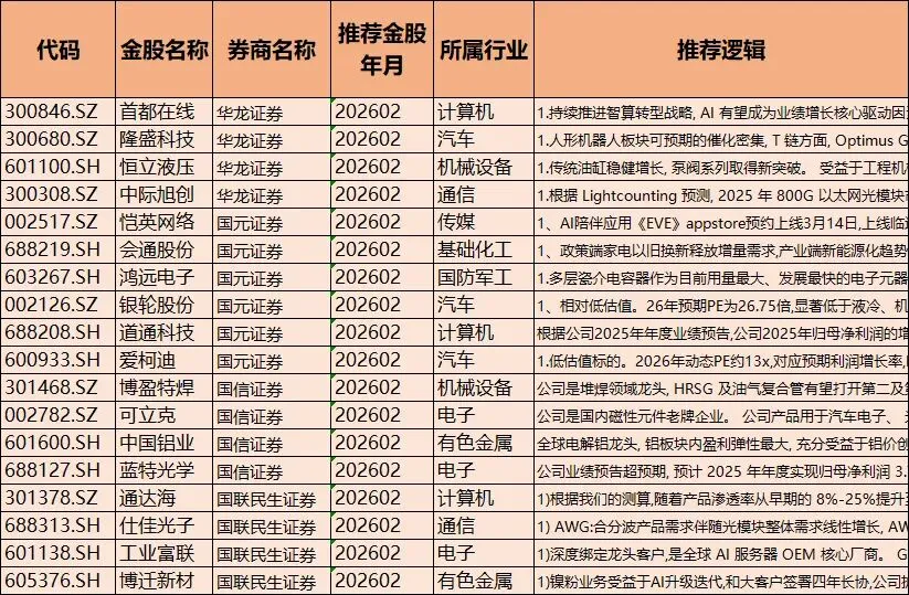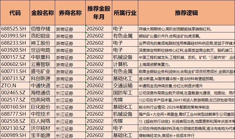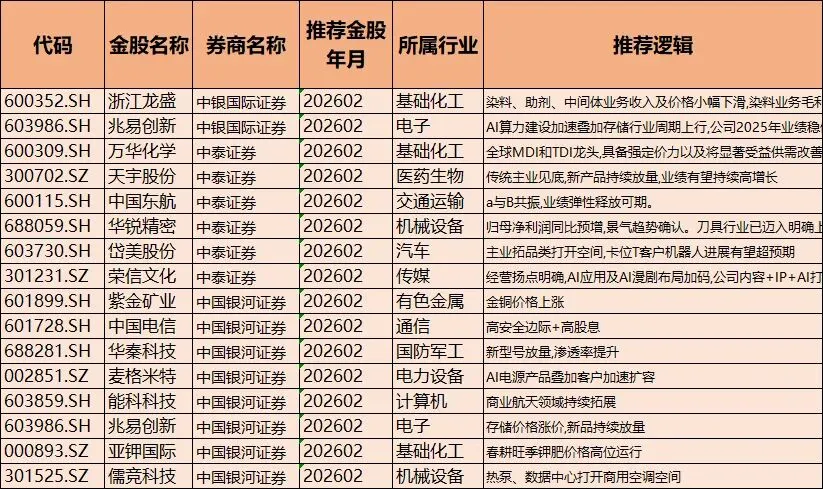 今年2月,平安证券、中银国际证券、西部证券、申万宏源等各大券商推荐的月度金股出炉,包含有色金属、医药、商业航天、半导体、高端装备、通信设备、计算机设备、消费电子、AI应用等行业主题。具体名单如下: