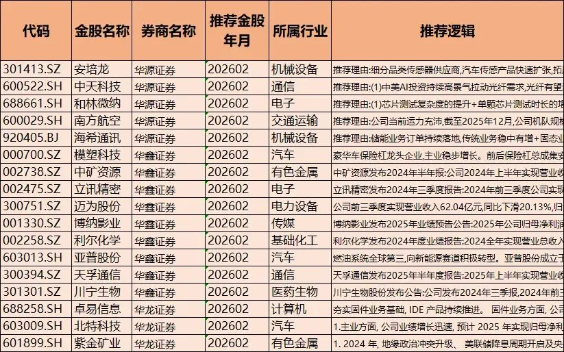 包含:长城汽车(西部证券推荐)、国邦医药(原料药与医药中间体出口企业)、日联科技(X射线检测设备供应商)、华峰铝业(车用铝热传输复合材料龙头)、深南电路(主营通信、数据中心及封装基板产品)、中矿资源、福斯特(主营EVA/POE胶膜及电子感光干膜材料)、骄成超声等。