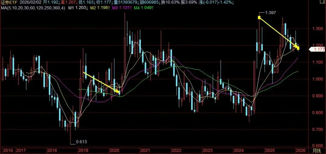 现在,券商行业处于其上升周期32浪末期,自2024年11月8日1浪见顶后,券商一直徘徊震荡了15个月。对比上一轮2019-2021上升周期,券商在1浪见顶后也是震荡了14个月才发起33浪主升,见图1黄线标识。