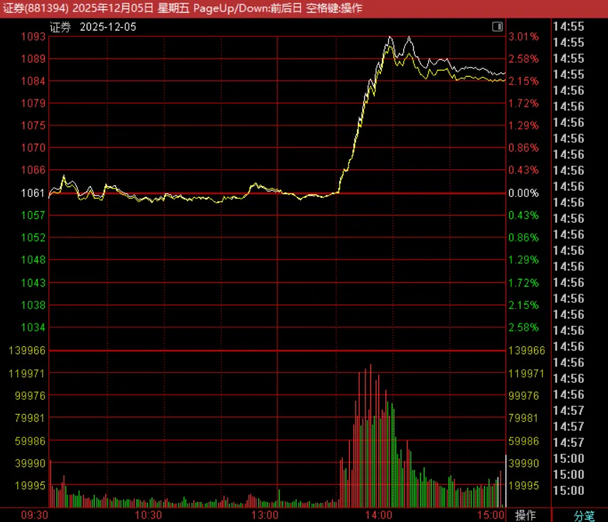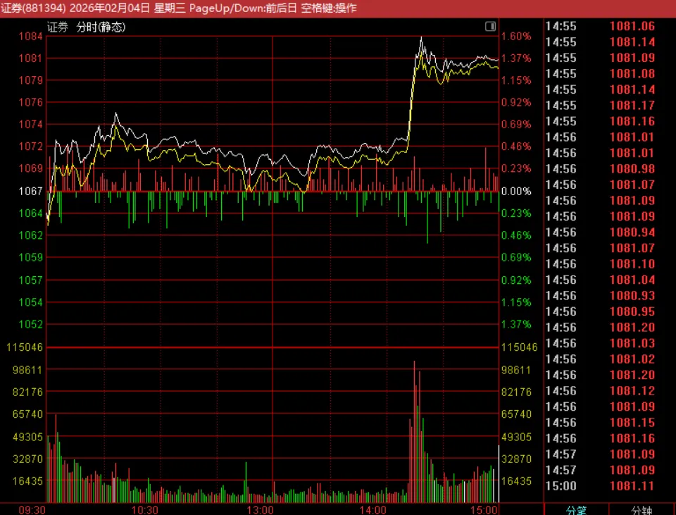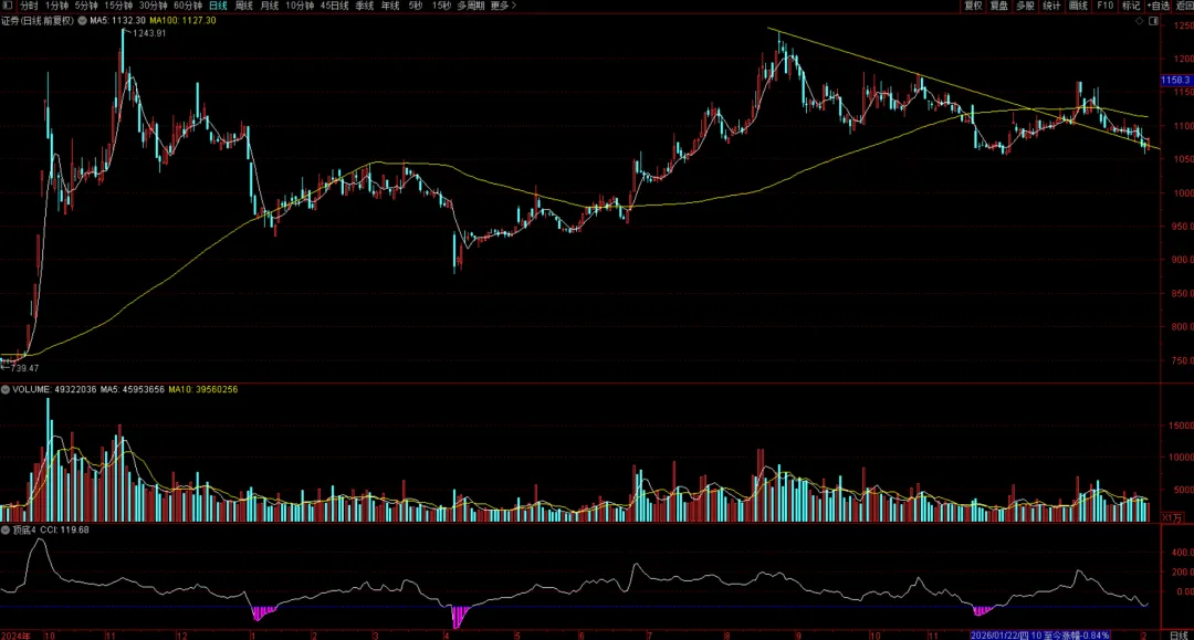 券商异动拉升,权重搭台的下一句是什么?今天大部分时候的盘面死气沉沉,毕竟没人会喜欢资金涌向价值风格的缩量市场,中午我发了这样一条消息,黄金突破5000美元压力位和人民币升值整体是友好环境,并反人性逐步抄底科技尾盘券商异动拉升,结束了本来死气沉沉的盘面,多么熟悉的味道啊。记得本号去年11月底那篇经典文章12月:再见了,地量吗?告别地量的标志之一是券商触底反弹用之前的方法再看此时的券商:如果看证券的周线,调整的时间周期一般是5周,目前时间够了,且收在55周均线。CCI指标发出本轮牛市以来第四次底部信号。不出意外,这里券商就是底部在没有人为打压的情况下,证券指数就是成交量的映射,也许我们能第二次宣布“再见了,地量”!在券商不成为打压大盘的工具时,更多是搭台子的。权重搭台的下一句是什么?