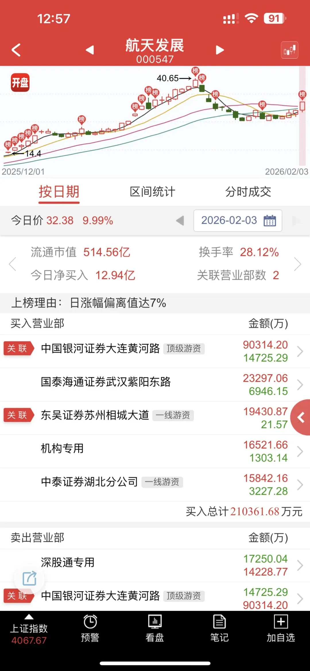 以9亿的封单买入航天发展