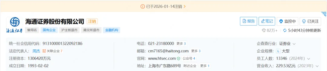 偶然点开企查查,收藏夹里的“海通证券股份有限公司”,显示为“注销”,日期是2026年1月14日。