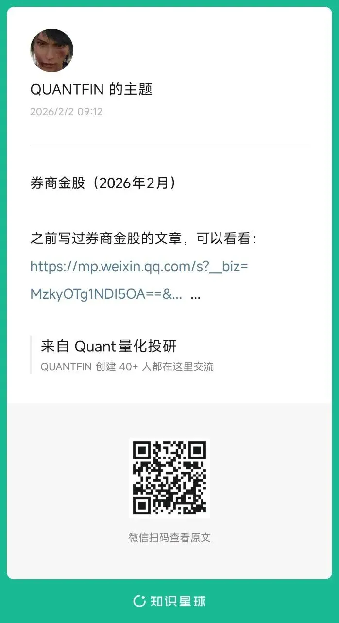 券商金股(2026年2月)我们2月4号分析了近期的涨价线索个股,其中一个当日盘中涨超2%。我们2月3号从25年预报中的400多个股票中选取了10只具有潜力的股票,其中一个2月3日盘中涨约4%。这一个股2月4日盘中继续大涨,涨超6%。我们1月24号推荐的个股,推荐后持续上涨,今天两个个股涨超3%。剩余策略不想写了,每天文章都会带一带策略的当日表现情况。感兴趣的可以阅读:技术指标实战(六)如何计算大盘的尾部风险?|最新推荐板块涨超5%推荐策略今日涨超7%!后续仍有空间!2026年1月,我们的策略涨幅超过40%!渔业养殖板块的外部冲击机会2025年,我们的选股策略表现如何?附2026年投资赛道展望推荐个股本周连续5日涨停!圆弧底组合出炉大盘强势站上3600点,我们的策略100%胜率!年度景气度选股策略|2025年度涨幅超390%!本周星球策略持续走强,单日最高涨超10%!券商股的周线规律与投资机会公募基金25年Q4持仓如何变化?|今日策略看好的个股盘中涨停!当前哪些行业有预期差?预期差带来哪些投资机会?A股版的马斯克概念指数发布—如何进行主题投资?数据中心REITS的机会|今日策略推荐个股涨停!2026年1月策略复盘2026年2月日历效应大宗商品牛市分析—A股的资产如何轮动?之前写过券商金股的文章,可以看看:11月券商金股组合10月券商金股组合3月金股组合强势,大盘会前需冷静2026年2月,我们梳理了券商的金股组合情况,具体如下所示:我们梳理了券商金股的前30名个股名单,并且整理了8家券商的2月金股组合,具体名单扫码阅读。我们每天文章都会带一带策略的当日表现情况,感兴趣的可以阅读:技术指标实战(六)如何计算大盘的尾部风险?|最新推荐板块涨超5%推荐策略今日涨超7%!后续仍有空间!2026年1月,我们的策略涨幅超过40%!渔业养殖板块的外部冲击机会2025年,我们的选股策略表现如何?附2026年投资赛道展望推荐个股本周连续5日涨停!圆弧底组合出炉大盘强势站上3600点,我们的策略100%胜率!年度景气度选股策略|2025年度涨幅超390%!本周星球策略持续走强,单日最高涨超10%!券商股的周线规律与投资机会公募基金25年Q4持仓如何变化?|今日策略看好的个股盘中涨停!当前哪些行业有预期差?预期差带来哪些投资机会?A股版的马斯克概念指数发布—如何进行主题投资?数据中心REITS的机会|今日策略推荐个股涨停!之前的文章分析过大盘指数与申万行业指数的择时策略:期权隐含波动率加权计算方法与择时应用期权持仓量PCR的底部择时信号TMT择时策略—吸筹率指标红利板块拥挤度指标与择时策略构建证券行业景气度指标构建与择时研究大盘择时策略-RUMI因子期权隐含波动率的底部择时策略RSRS在ETF交易中的择时信号期权VIX指数构建与择时应用期权隐含波动率择时信号成交量择时信号期权PCR择时信号A股大消费板块投资机会分析——2026年投资策略展望红利板块拥挤度指标与择时策略构建当下行业拥挤度如何?我们在之前的文章中分析了如何应用技术指标来判断指数的后续走势,相关文章可阅读:技术指标实战(一)均线的动量效应技术指标实战(二)MACD的动量效应技术指标实战(三)济安线的动量效应技术指标实战(四)风险度的择时效果技术指标实战(五)如何量化指数的趋势和风险度?牛市投资系列文章:牛市中的回撤分析|如何在牛市中把握交易节奏?牛市中的风格分析|如何在牛市中把握风格切换?牛市的涨幅阶段分析|如何在牛市中把握行业轮动?牛市的涨幅阶段分析|如何在牛市中把握指数投资?牛市的top20个股分析|如何在牛市中把握个股二次配置机会?牛市的疯狂阶段分析|如何在牛市中锁定利润?牛市的五倍股分析|潜在五倍股投资机会分析牛市的抱团阶段分析|如何识别抱团行情?牛市的风格切换分析|哪些板块可能受益于风格高低切?银行板块在历次牛市中的表现如何?周期性行业研究文章:周期主题行业研究(一):上游资源指数周期主题行业研究(二):石油石化指数周期主题行业研究(三):公用事业指数周期主题行业研究(四):有色金属指数周期主题行业研究(五):建筑类指数周期主题行业研究(六):交运类指数周期主题行业研究(七):如何通过ETF投资上游资源指数?周期主题行业研究(八):如何通过ETF投资石油石化指数?周期主题行业研究(九):如何通过ETF投资公用事业指数?周期主题行业研究(十):如何通过ETF投资有色金属指数?周期主题行业研究(十一):如何通过ETF投资建筑类指数?周期主题行业研究(十二):如何通过ETF投资交运类指数?军工研究文章:军工板块分析(一):军工板块的整体表现与个股增持情况军工板块分析(二):政策驱动的逻辑军工板块分析(三):A股军工概念全解析军工板块分析(四):商业航天板块的投资机会高端制造研究文章:高端制造行业研究(一):电力设备指数高端制造行业研究(二):新能源指数高端制造行业研究(三):机械制造指数高端制造行业研究(四):汽车制造指数高端制造行业研究(五):碳中和制造指数