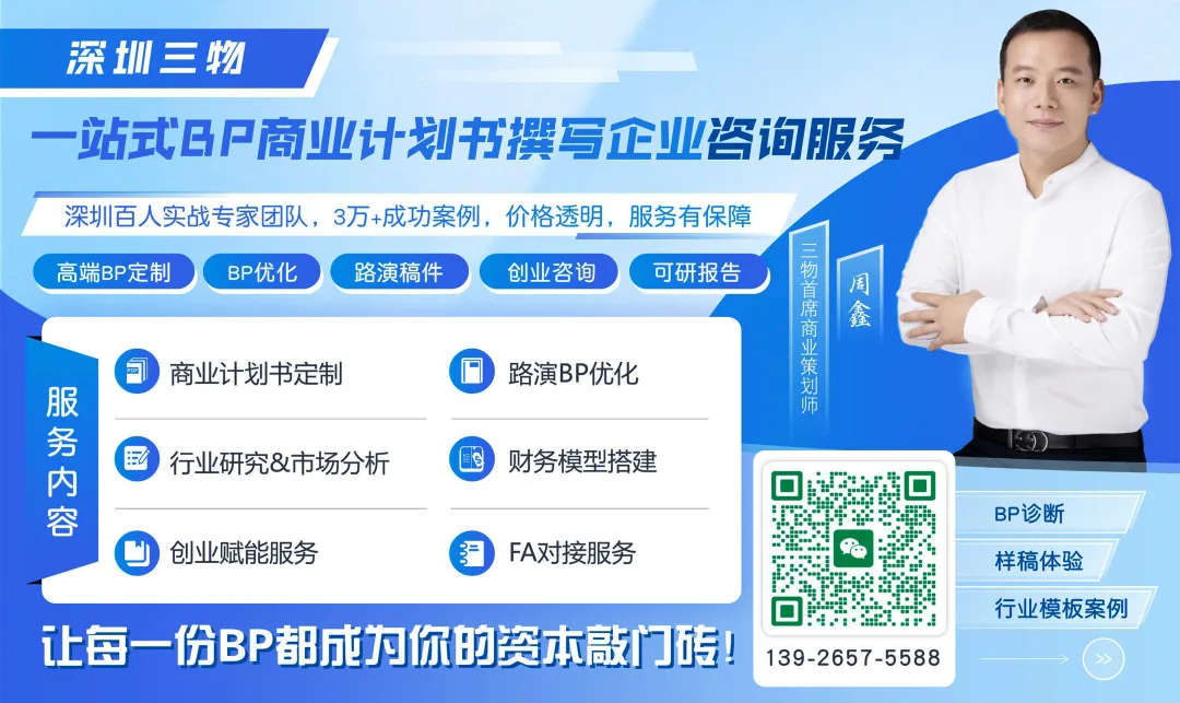 三物互联专注高端商业计划书代写、券商及金融科技企业全案咨询服务。需要BP梳理、融资对接、创新项目孵化,欢迎评论区留言【三物互联】,或搜索首席策划师“商业计划书周鑫”对接全案例库与实操经验。