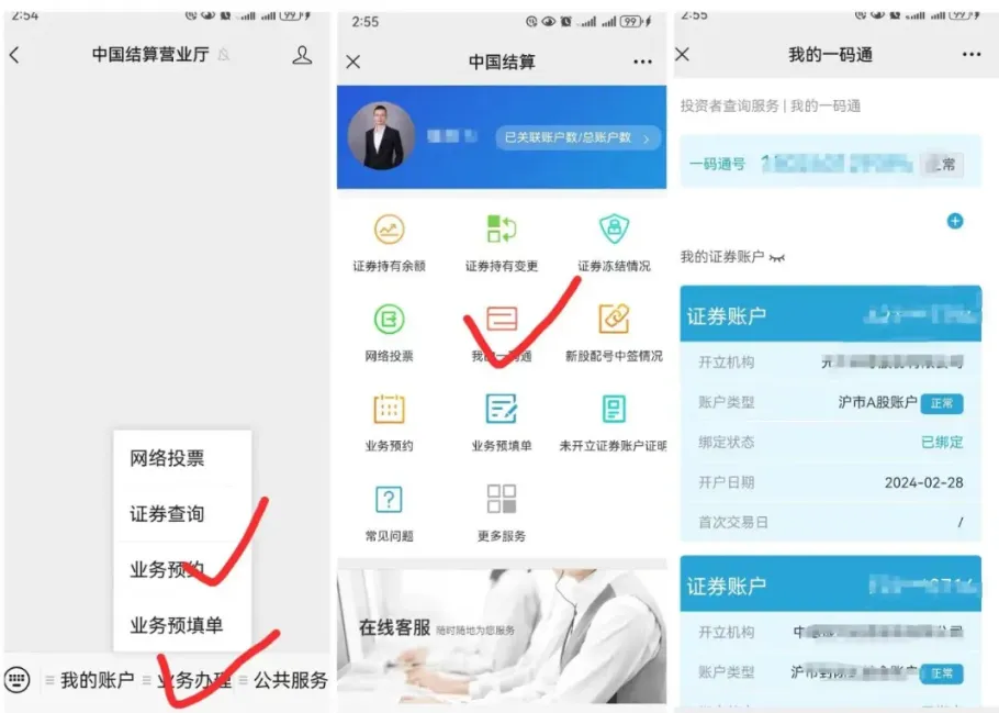 2. 中国结算营业厅公众号或者APP,找到“业务办理”,再点“证券查询”,就能看到自己的一码通信息,里面有详细的账户数量。注意:1个沪A账户,就占用1个限三名额,开满3个,就只能做不限三的单子了。