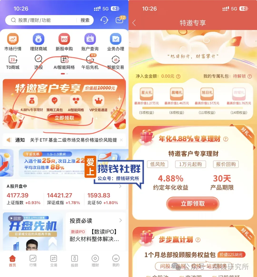 兴业证券APP→首页→更多→理财服务→E起投→点击学习→领取8.18%理财券