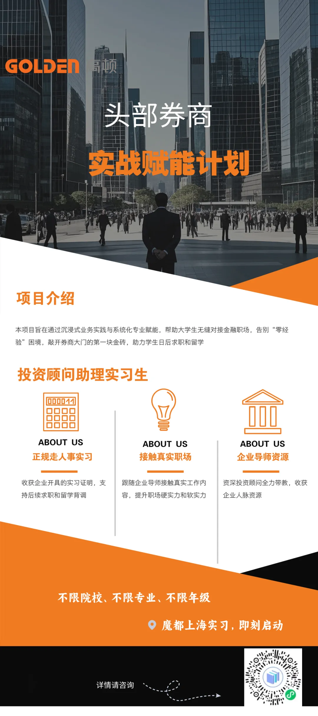 提供给每一位有金融行业梦想的学生一次近距离接触的机会,探索个人职业前景,短时间内积累实习经历。