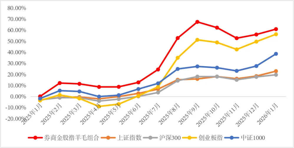 3.我们将“券商金股撸羊毛组合”更新至2026年1月,组合表现效果见下图:(注:数据来源于通联数据、Wind)
