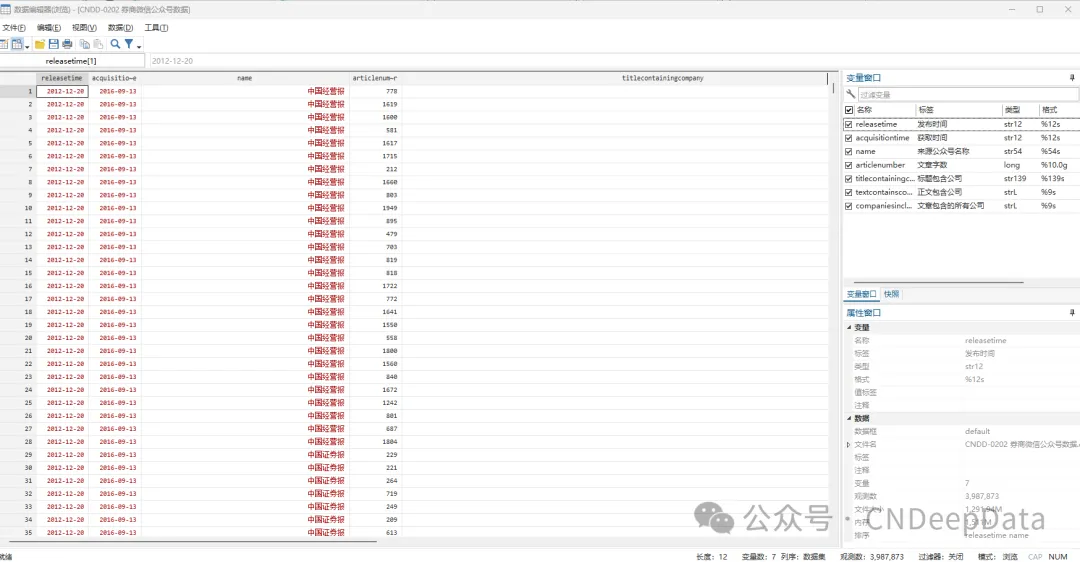 ▪ 数据说明:CNDD券商微信公众号数据整理了券商公众号报道数据,包括发布时间、获取时间、来源公众号名称、文章字数、标题包含公司、正文包含公司、文章包含的所有公司等变量,数据可爬取情况有限,可能存在统计不上情况,为正常统计误差,不影响数据使用。数据文件较大,仅提供.dta格式,仅可使用stata打开。
