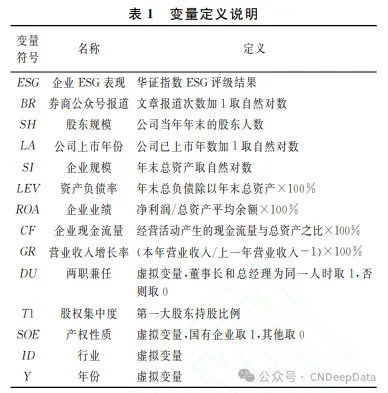 解释变量:券商公众号报道。使用企业被券商公众号报道次数作为变量, 并以券商公众号推荐次数作为稳健性 检验变量。根据“文 章出现的所有股票代码”和“正文推荐的公司股 票代码”,统计每一个企业在券商微信公众号中 被报道或被推荐的次数,一篇文章中若同一股 票代码出现多次,则仅计算为出现一次,最终以 “ln(1+报道次数)”和“ln(1+推荐次数)”记录。