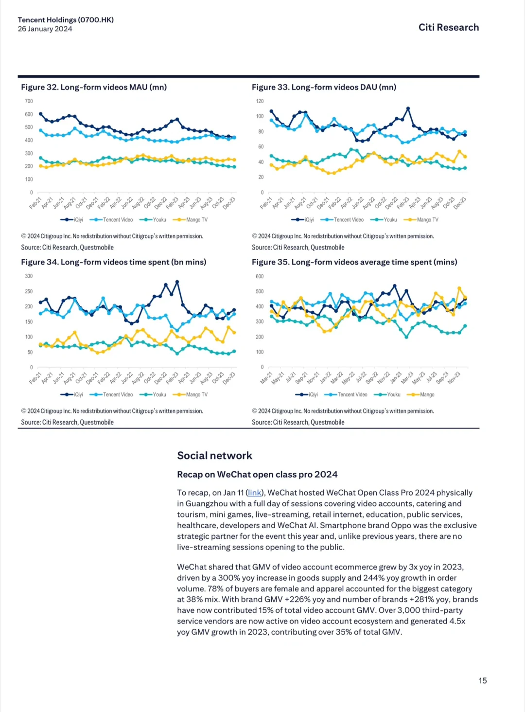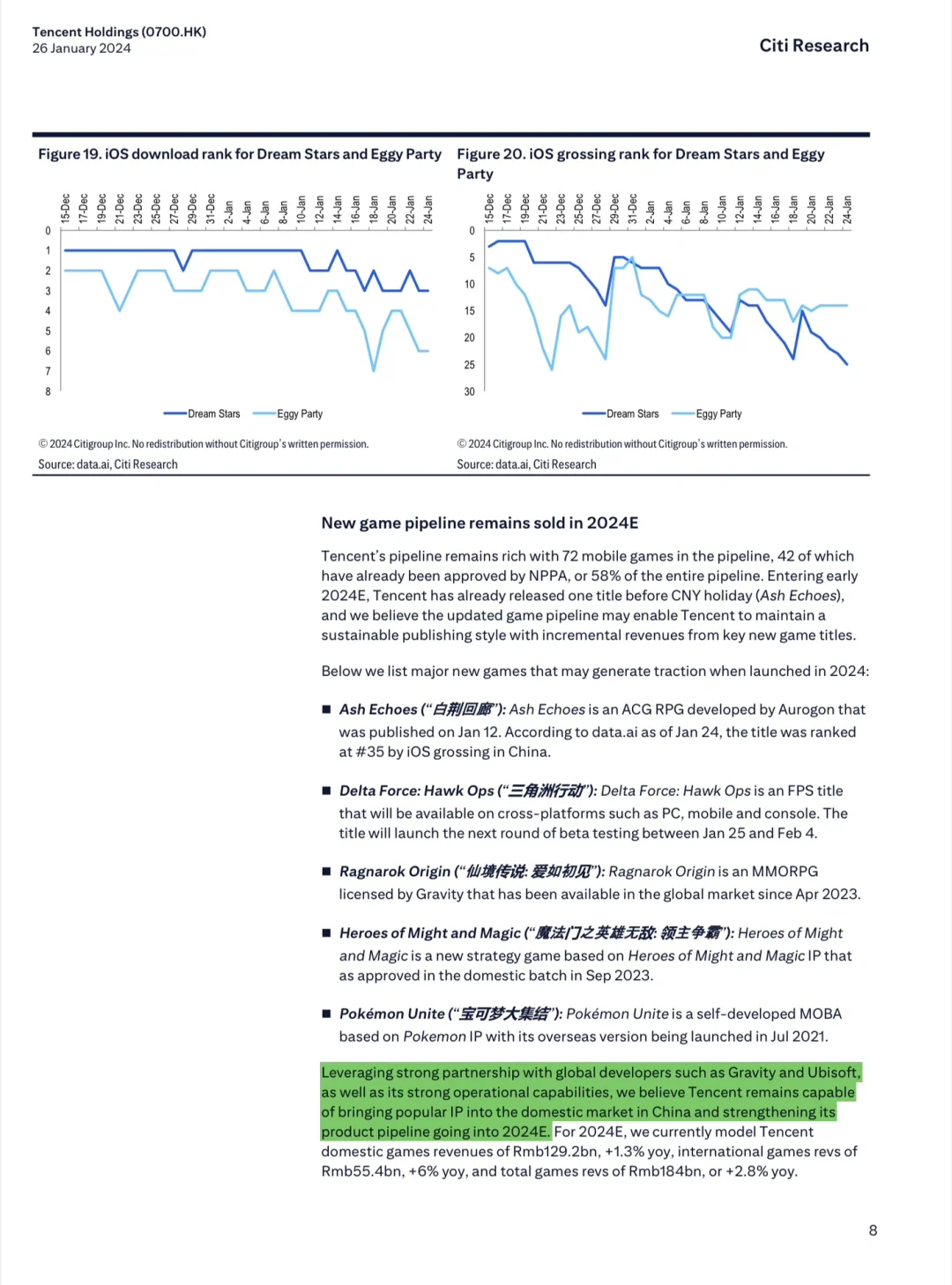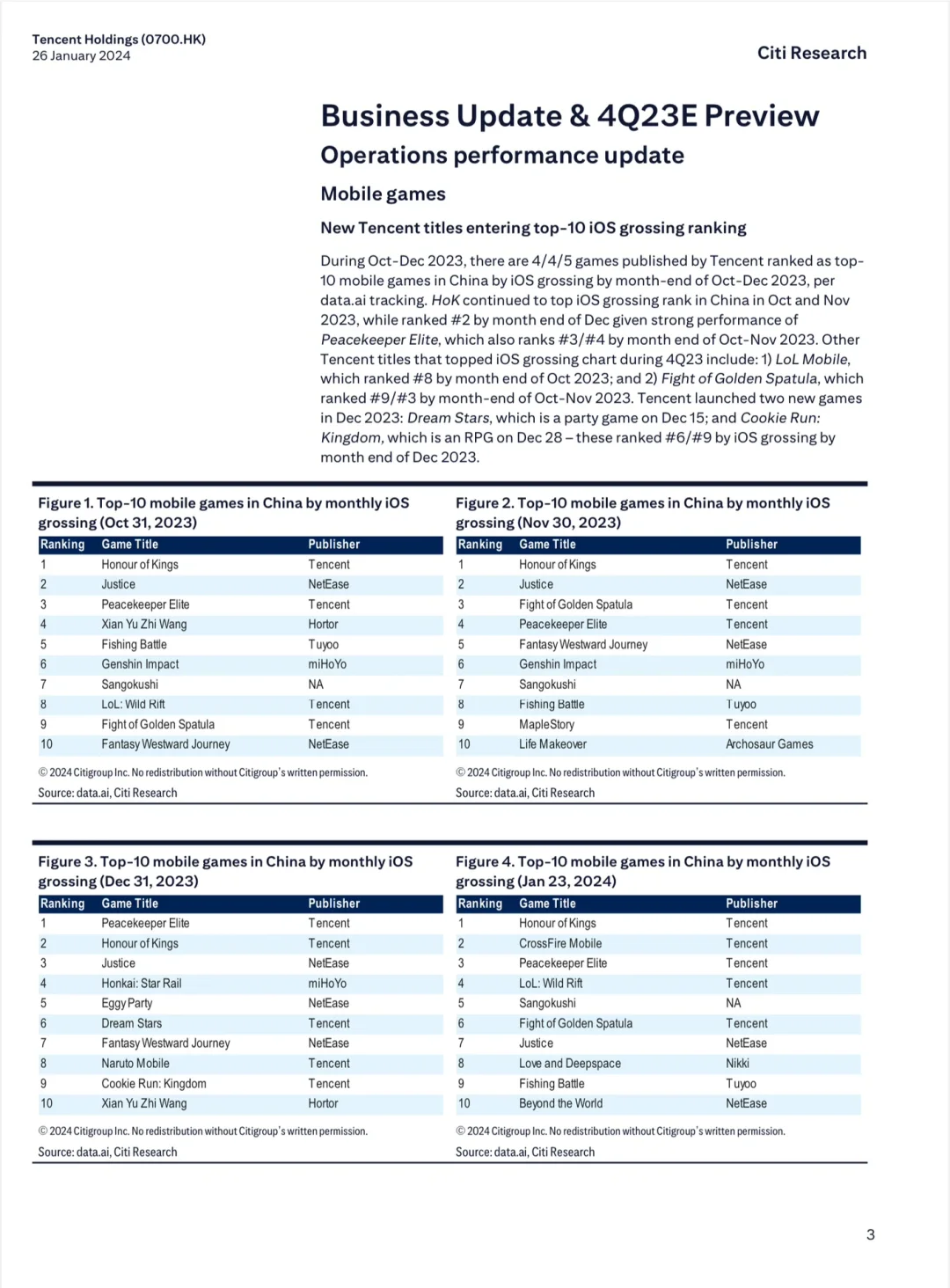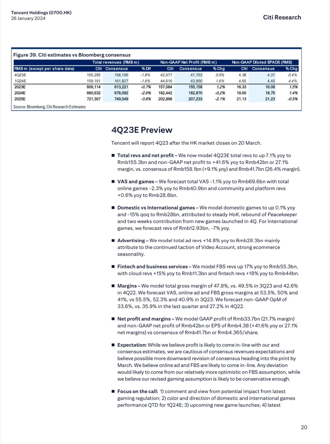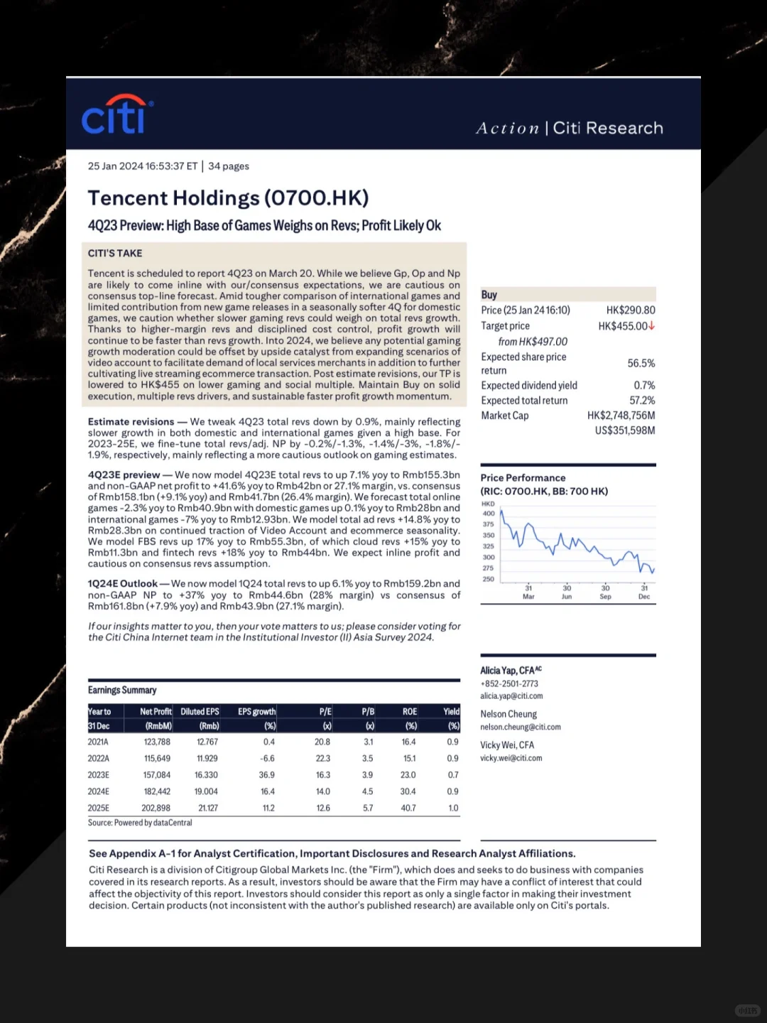 开篇花旗认为腾讯的高营收利润、成本管控将有助于它交出一份漂亮的利润增长成绩单。腾讯在短视频、直播带货等领域的投资持续加码,2024 的增长势头不错。报告中段,花旗针对腾讯的手机游戏、电脑游戏、视频和流媒体等业务分别进行了业绩分析。最后,花旗更新了对腾讯增长的预测以及在不同情境下的股价预测。