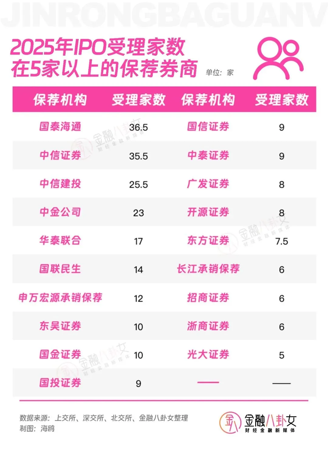 紧随其后的第三到第五名,分别是中信建投、中金公司、华泰联合的25.5家、23家、17家。这前五名的IPO保荐项目受理家数总和,就占了全年总数的45%以上。中金合并东兴和信达完成后,排名还会提高。