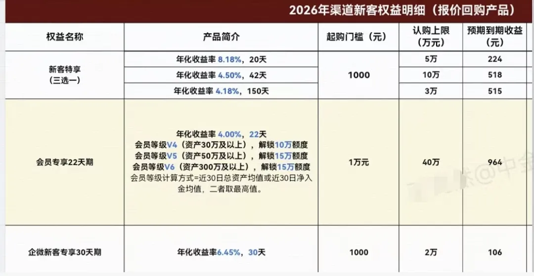 中金财富为新客户提供了多种选择,最高可买满42万元额度,合理规划可获得可观收益。