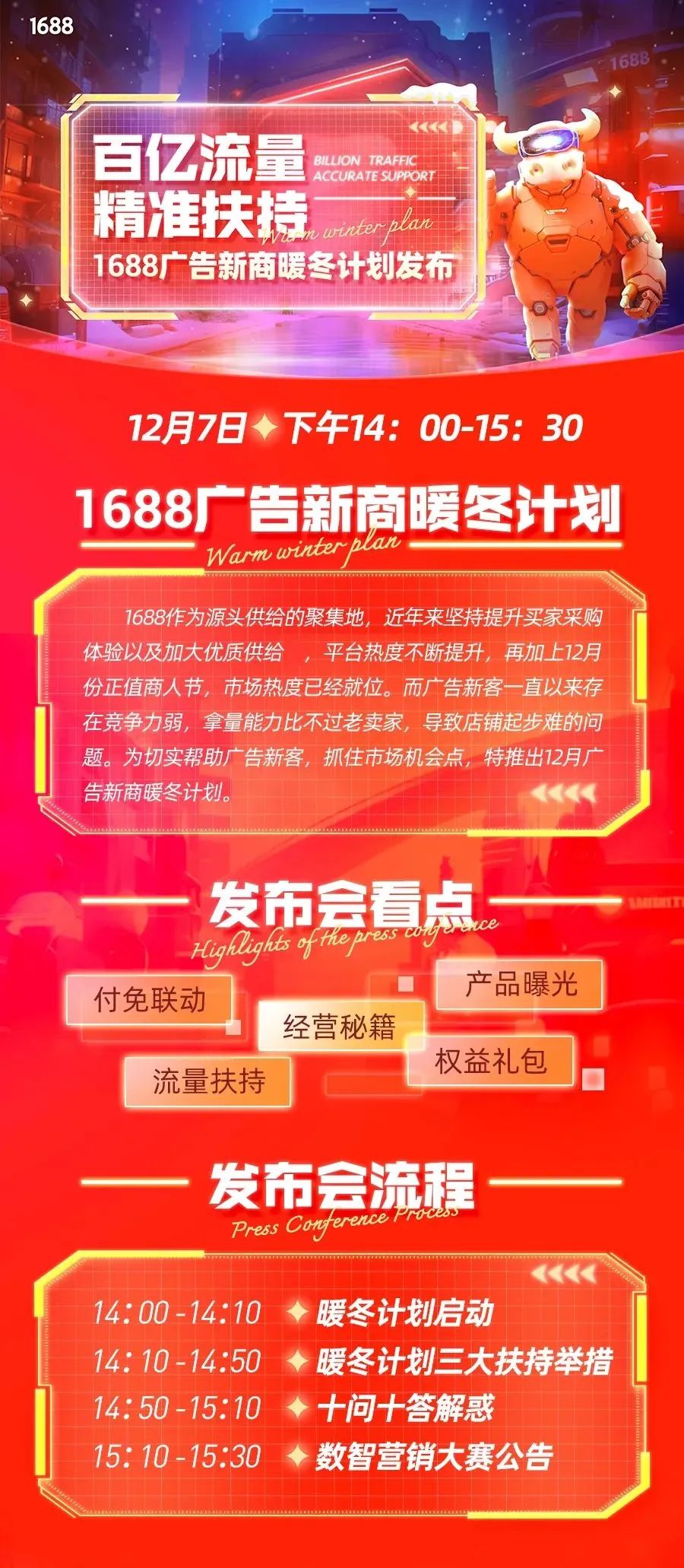 点击蓝字关注我们新商家在1688引流推广,有重磅新福利了!推广新用户双倍流量激励百亿流量扶持提供简单高效获取流量神器投放期持续多重权益加持……12月7日,今天1688将正式推出“百亿流量 精准扶持”新商帮扶举措具体内容都在这场直播里12月7日(周四) 下午14:00-15:30↓ ↓ ↓ 点击下方卡片,预约吧 ↓ ↓ ↓选择我们,关注更多生意资讯,获得更多生意可能