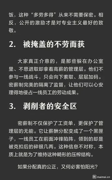 密薪制原本是为了保护员工隐私,避免薪资攀比,但在实际操作中,却可能成为管理层高薪的遮羞布。基层员工辛苦工作,却难以了解自己的薪资是否公平,而管理层则可能利用这一制度获得不合理的高薪。
