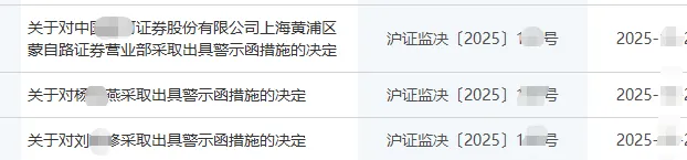 2025年12月,上海证监局连发3张处罚决定,对证券从业人员刘某修出具警示函,对其所在证券营业部及其负责人分别出具警示函。