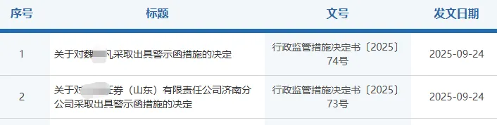 2025年9月,山东局发布2份处罚决定,对证券从业人员魏某凡及其所在证券分支机构分别采取出具警示函的行政监管措施。