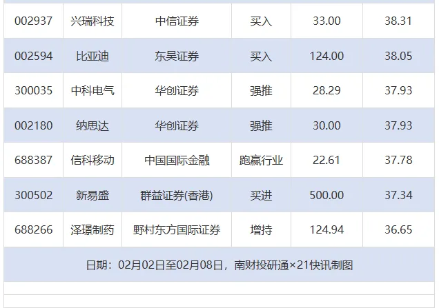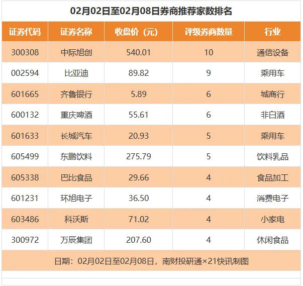 从券商推荐家数来看,2月2日至2月8日有208家上市公司得到券商推荐,其中中际旭创获得10家推荐,比亚迪获得9家推荐,齐鲁银行、重庆啤酒获得6家推荐。