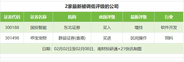 评级调低方面,2月2日至2月8日,券商调低上市公司评级达到2家次,最新数据包括了东北证券对国投智能的评级从“买入”调低至“增持”,群益证券(香港)对乖宝宠物的评级从“买进”调低至“区间操作”。