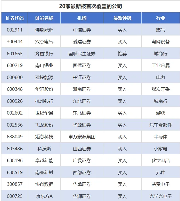 首次覆盖方面,2月2日至2月8日券商共给出了73次首次覆盖,其中佛燃能源获得中信证券给予“买入”评级,双杰电气获得爱建证券给予“买入”评级,齐鲁银行获得国联民生证券给予“推荐”评级,南山铝业获得国盛证券给予“买入”评级,建投能源获得长江证券给予“买入”评级。