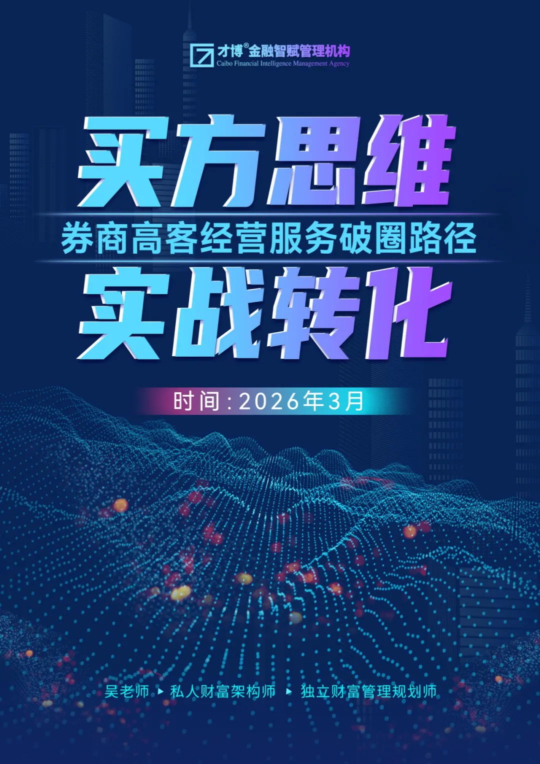 针对这一痛点,才博金融深入洞察转型路径与展业实际,携手长期服务超高净值家庭的实战导师吴老师。其专业能力已获市场真金白银的验证,本课程即为其方法论的深度融合,旨在为券商呈现具有实战价值的高净值客户服务模式。