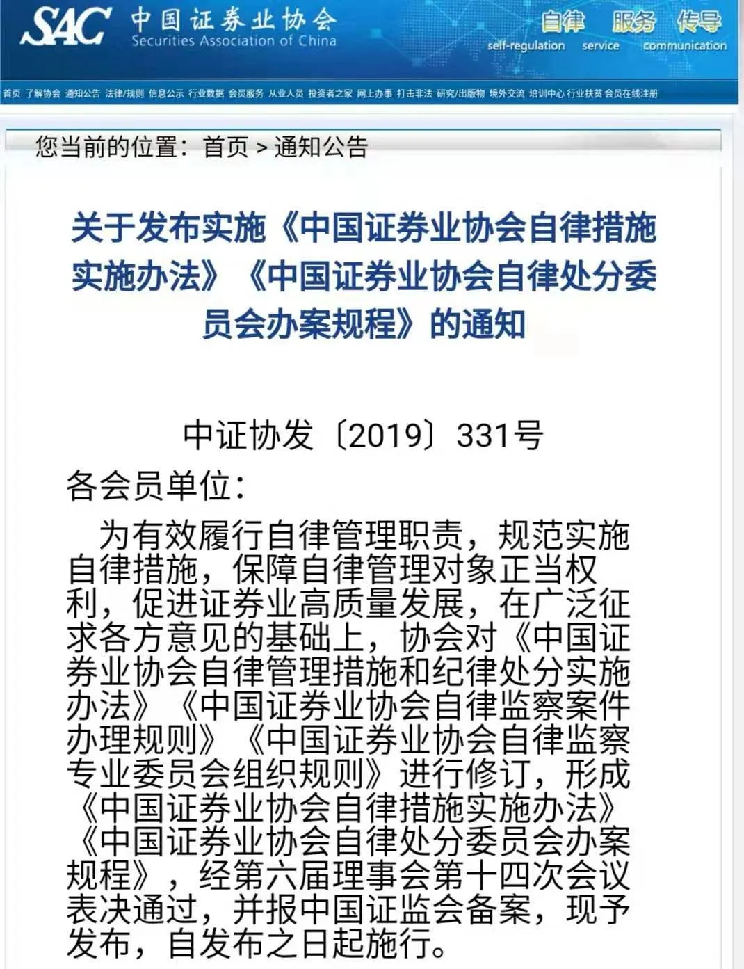 12月4日,中国证券业协会(简称“中证协”)下发了《中国证券业协会自律措施实施办法》,明确了中证协有权利对券商、证券从业人员给予自律管理措施和纪律处分,并设置了调查部门、审理部门和自律处分委员会,其中,后者负责重大纪律处分案件的复审和全部案件的复议。目的旨在有效履行自律管理职责,规范实施自律措施,保障自律管理对象正当权利,促进证券业高质量发展。
