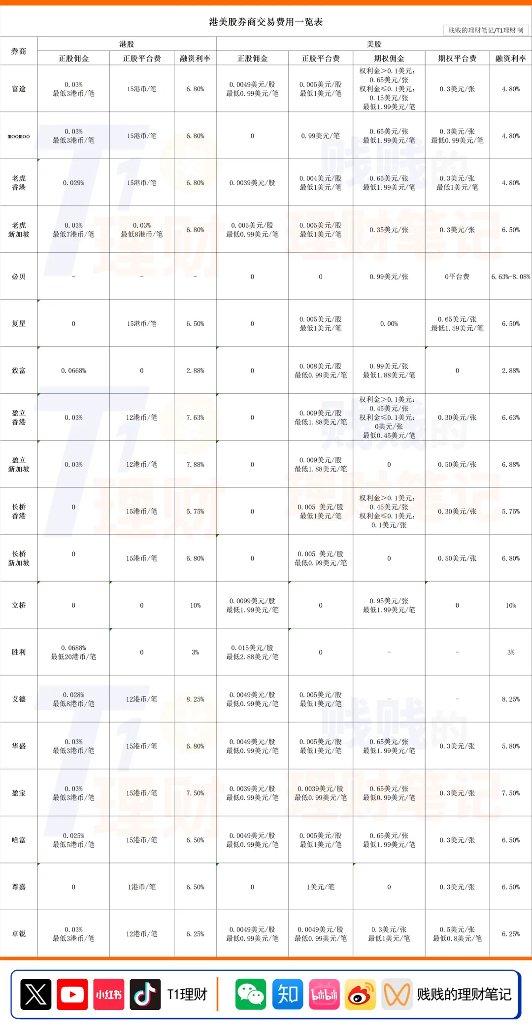 上篇给大家更新了各家港美股券商打新的手续费,今天再给大家说一下各家券商港美股交易费用及融资利率,数据均来自各券商官网收费说明,需要注意的是下方的佣金和平台费均为标准费用,部分券商是可以根据自己交易频率来设置的,例如高频交易用户的费率会随着你交易次数上升而降低费用。另外对于期权的佣金部分券商也是支持进行同样设置或者类似必贝可以通过买期权套餐来降低费用。目前能开的券商也不多了,如果有需要开的可以随时文末联系。