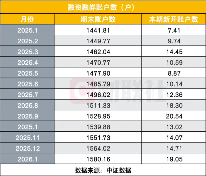 从期末账户数来看,两融市场的存量规模也在持续扩张。2025年1月,两融期末账户数为1441.81万户,经过一年的稳步增长,2025年12月已达1564.02万户,2026年1月进一步增至1580.16万户,存量账户数在持续攀升,为两融业务的后续发展奠定了基础。