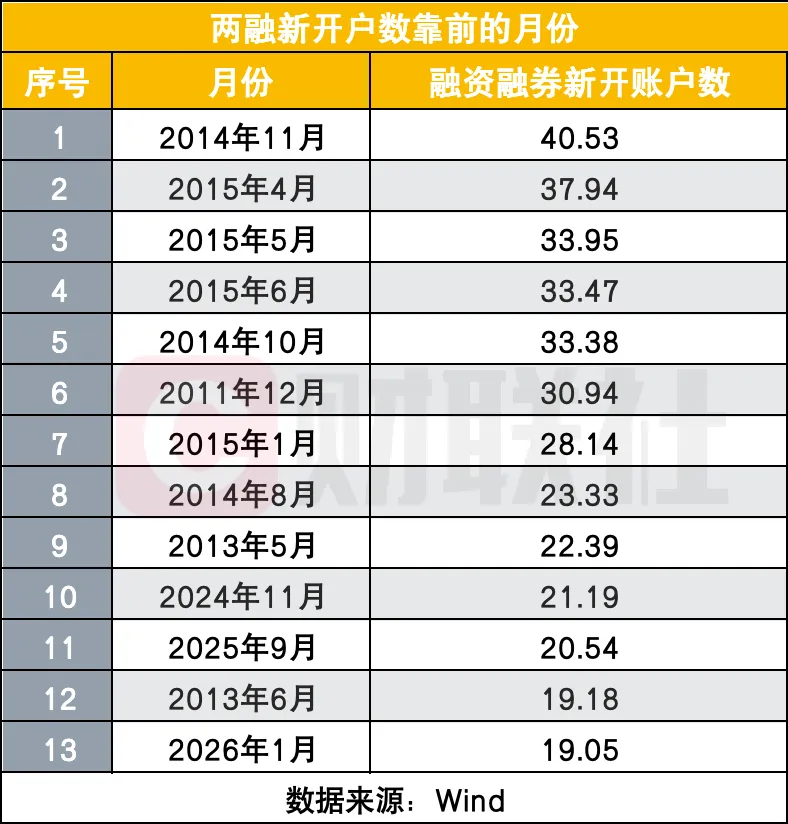 从历史维度来看,2026年1月的两融开户数也跻身历史前列。Wind数据统计显示,2012年以来共有13个月份两融新开户数超19万户,2026年1月以19.05万户位列第13位,历史最高单月曾新开40.53万户。