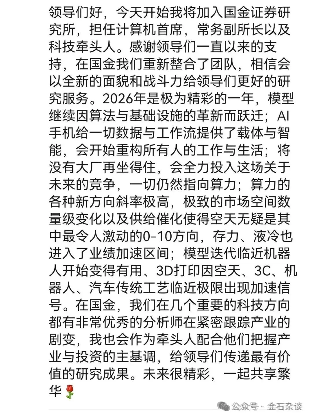 券商年终大瓜!休假成原罪?所长太霸气,直言“今年奖金取消”2月10日消息,券商圈年终大瓜,深陷离职潮的国盛研究所成为了今日谈资。看情况是,所长责问某机械分析师“很忙?”,可能是没按时上班或者推脱了某些事。机械首席回复:“我安排好”。然后,该所长表示“工作日想放假可以辞职”,直言“今年奖金取消”,“以后再有此事,一路劝退”,并@人力,人力这也是秒回,所长的权力还是可以的。随后,所长大概说了下自己生气的原因,天天嚷着加薪,工作日找不到。关键在这行情下还加薪了,加完了就这工作态度。不过,据社区平台消息,目前该事件已经平息,据说该分析师是因为去调研推掉了销售的路演,而被所长公开怼。坊间消息,目前俩人一个已休假,一个明天回家过年。去年11月下旬,国盛研究所被传大地震。截图显示,ZZX去买方;ZJY即将出任国联民生研究所副所长;LGC即将加入东方财富研究所。随后靴子全部落地,风波中的郑震湘,张金洋以及刘高畅三人相继离职。1月4日,中国证券业协会信息显示,郑震湘已无任职信息,应该是已经离职。值得注意的是,郑震湘2024年12月才从方正证券辞职,重返国盛证券研究所,并担任研究所联席所长、电子首席分析师一职,至今入职刚满一年。郑震湘已8次入选新财富最佳分析师,在业内享有“科技产业大咖”之称。知情人士透露,其下一站是买方,但也有消息人士表示其下一站是去做产业。相较于12月底,金石杂谈查询国盛电子官微团队介绍中,郑震湘联席所长、电子首席在第一行分外醒目。如今,郑震湘的名字已被抹去,不过“湘论科技”的名字还未更改。在团队介绍中,佘凌星不再是联席首席,而成了电子首席,联席首席为为以前的电子分析师钟琳。其中,佘凌星和钟琳都曾联席四年荣获新财富前三名。此外,该团队除了刘嘉元,其他人均未离职。此外,张金洋从事医药投资研究10年,有3年产业经验,2019年1月加入国盛,现任国盛证券研究所所长助理、医药首席分析师,曾就职于东兴证券、银河证券、民生证券及西安杨森制药,他同样多次上榜新财富。据悉,张金洋下一站是国联民生研究所副所长。此前,金石杂谈查询发现,张金洋的个人公众号在停更1个月后的12月14日已经更新为国联民生证券医药团队。截至目前,国盛医药联席首席胡偌碧已于25年12月17日加入国联民生;医药分析师杨芳已于12月5日加入国联民生;医药分析师王彦迪12月30日加入国联民生。刘高畅,出生于1990年,曾是最年轻的计算机行业首席,离职前担任国盛证券计算机行业首席分析师,兼任所长助理及机器人大组组长。刘高畅在2021年新财富最佳分析师评选中获得计算机行业第一名,并连续三年蝉联榜首。刘高畅团队离职让外界有些措手不及,就在11月28日刚刚拿到新浪财经金麒麟计算机最佳分析师第一名。去年11月的市场传闻,刘高畅将加盟东方财富研究所。前几天刘高畅自曝,加入国金,担任研究所副所长、计算机首席、科技负责人。截至目前,赵伟博、陈芷婧、李可夫均已加入国金研究所,担任分析师;而徐少丹尚未更新协会信息。至于公司研究所业务,收入持续缩水,21年中期高达2.2亿,24年上半年缩水26.67%至1.32亿,如今研究所收入已不足1亿,即便相较2023年也几乎腰斩。