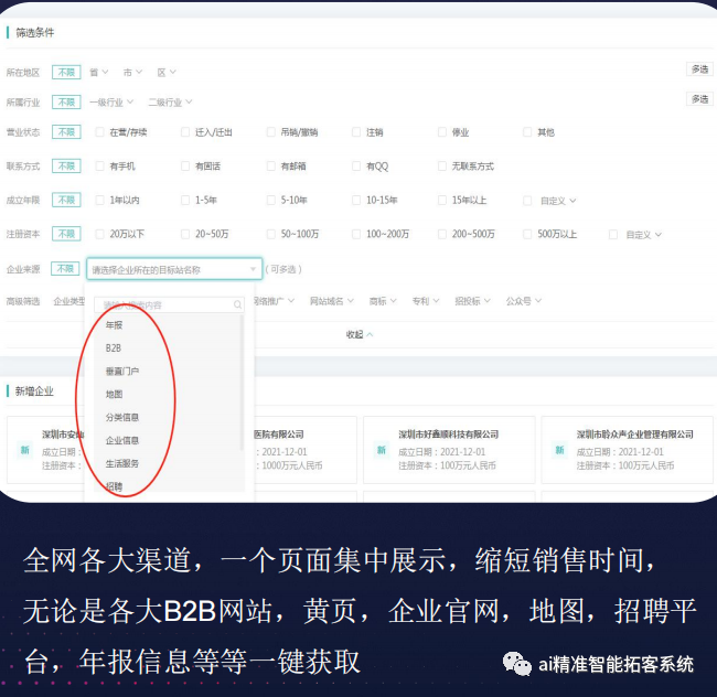 营销系统功能一:基础采集,对接常见权威渠道,帮你采集各行业,地区客户信息