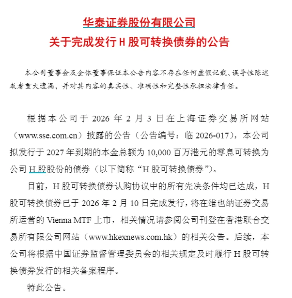 华泰证券境外重大融资完成。华泰证券2月3日公告称,公司拟发行于2027年到期的本金总额为100亿港元的零息可转换为公司H股股份的债券(以下简称H股可转换债券)。目前,H股可转换债券认购协议中的所有先决条件均已达成,H股可转换债券已于2026年2月10日完成发行,将在维也纳证券交易所运营的Vienna MTF上市。