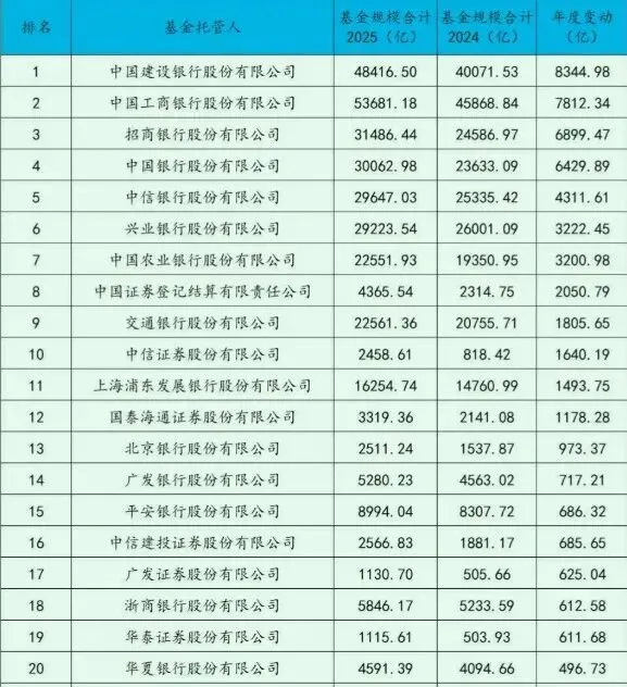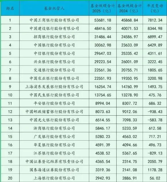 中国工商银行以5.37万亿元托管规模位居榜首,2025年规模增长约7812亿元。