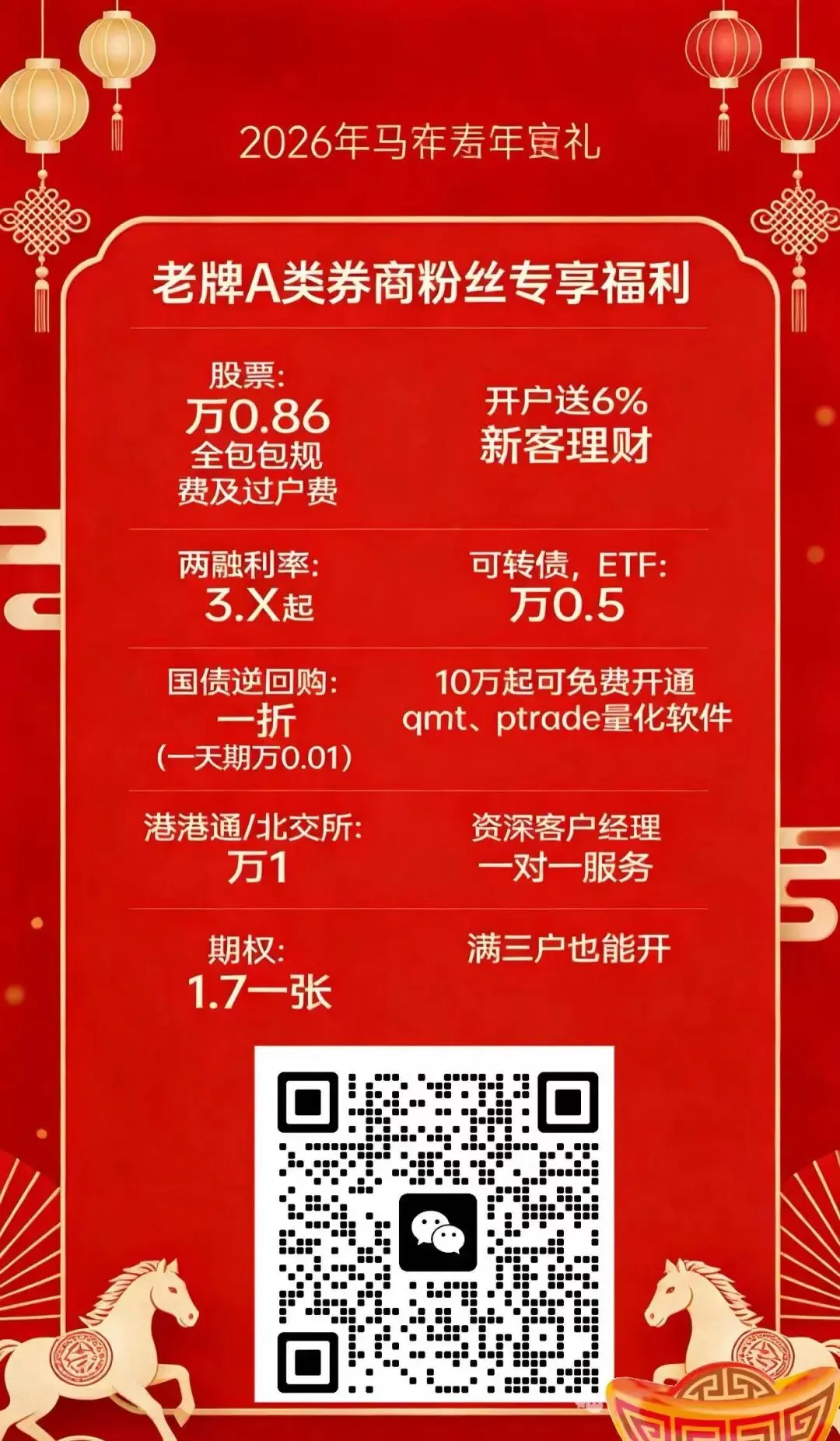 新年新气象,换个新券商账户长虹马上就要过年啦,打算换个新券商,图个“新账户、新气象”,也希望新的一年能鸿运当头。之前用的券商系统用起来不太顺手,这次找的是合作很久券商的朋友,给到的福利、政策和服务都让人很放心,交易成本也比较有优势。如果大家也有换券商或者新开账户的需求,可直接添加图中二维码小助理,备注“大A”,开户成功后就能加入大A资讯VIP裙。祝各位老师:马年纳福,满仓飘红
