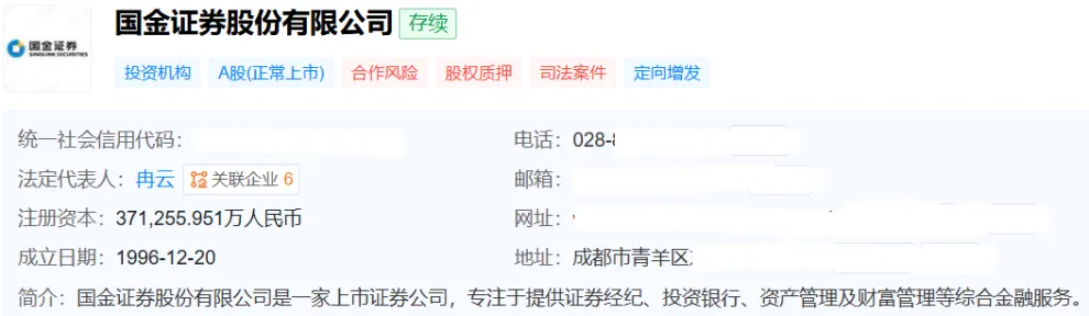 天眼查显示,国金证券成立于1996年12月20日,注册资本约为37.13亿元,法定代表人是冉云,他也是该公司党委书记、董事长。