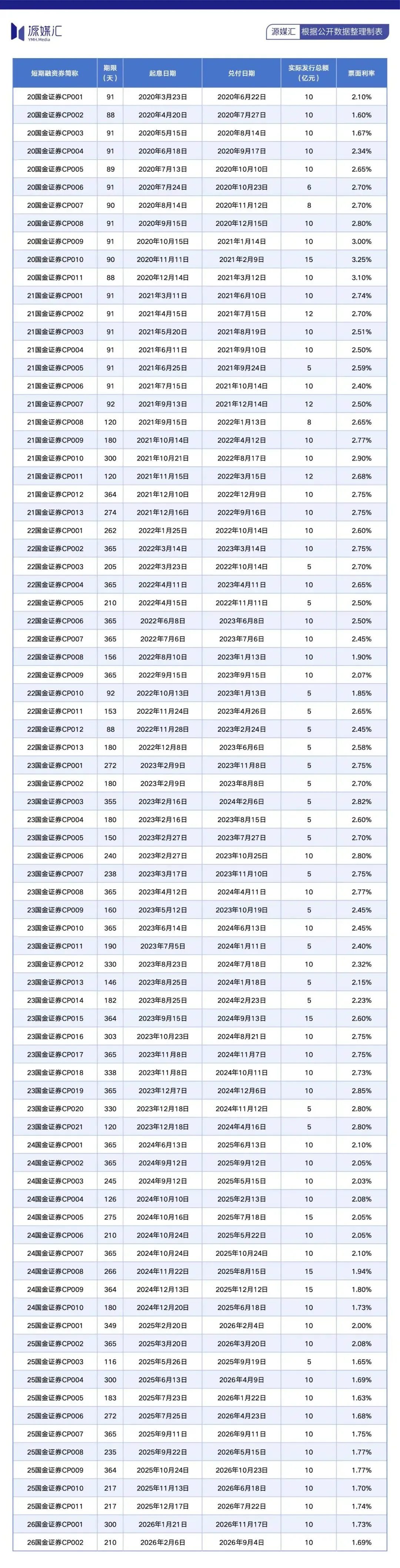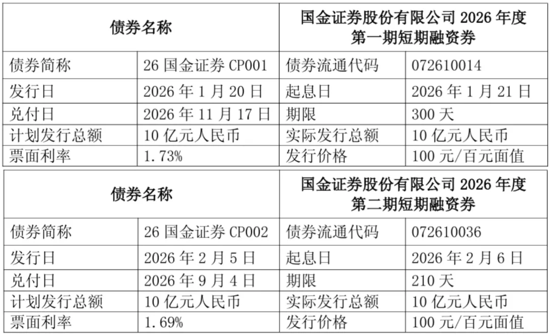 2026年1月以来,国金证券已完成了两期短期融资券的发行,分别是“26国金证券CP001”“26国金证券CP002”(即本文开头提到的两期),合计发行总额为20亿元,到期兑付日分别是2026年11月17日、2026年9月4日。