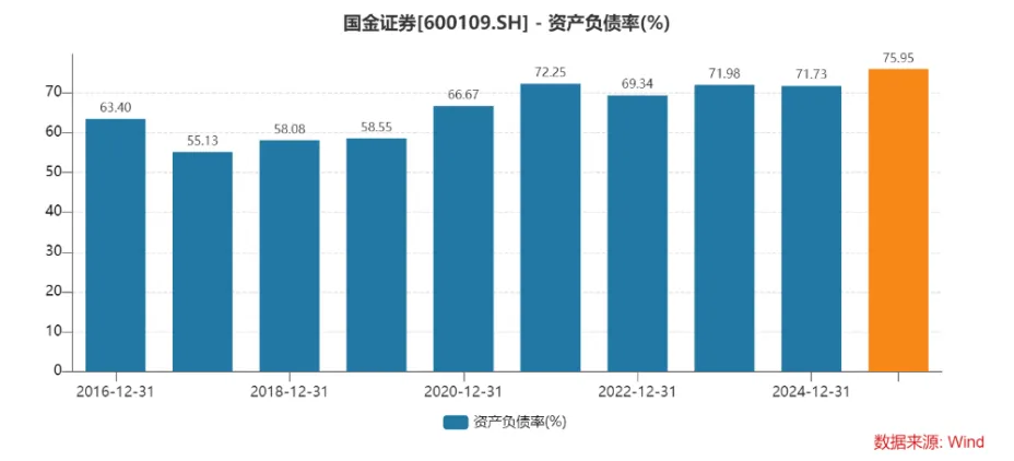 截至2025年三季度末,国金证券的资产总额约为1460.69 亿元,负债总额约为1109.34 亿元,资产负债率达75.95%,较2024年末上升4.22个百分点。75.95%的资产负债率,在A股50家上市券商中排名第35位,也是国金证券近十年来的最高数据。