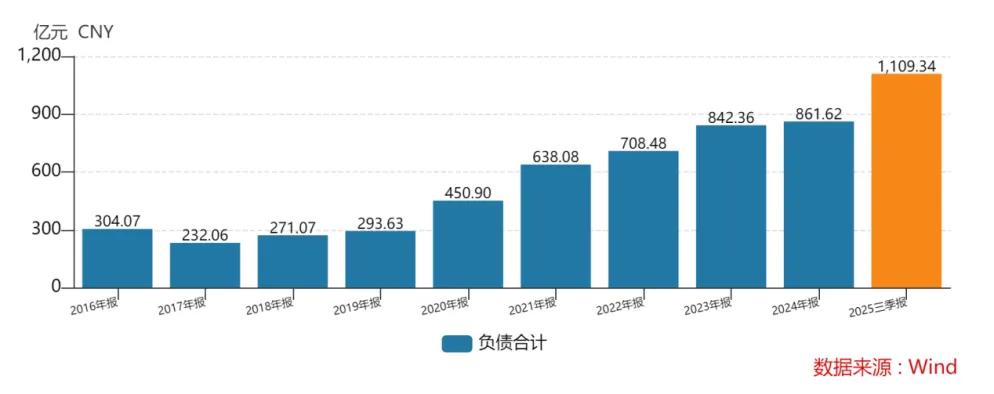 从负债增长轨迹看,国金证券近十年的负债规模从304.07亿元增至1109.34亿元,激增逾805亿元。尤其是2025年三季报负债总额较上年同期增加342亿元,同比增长44.57%,远超同期营收增速。