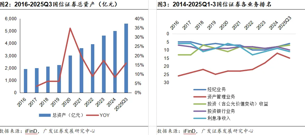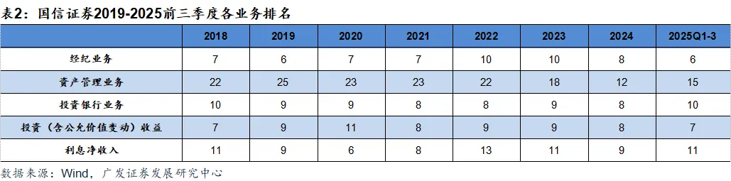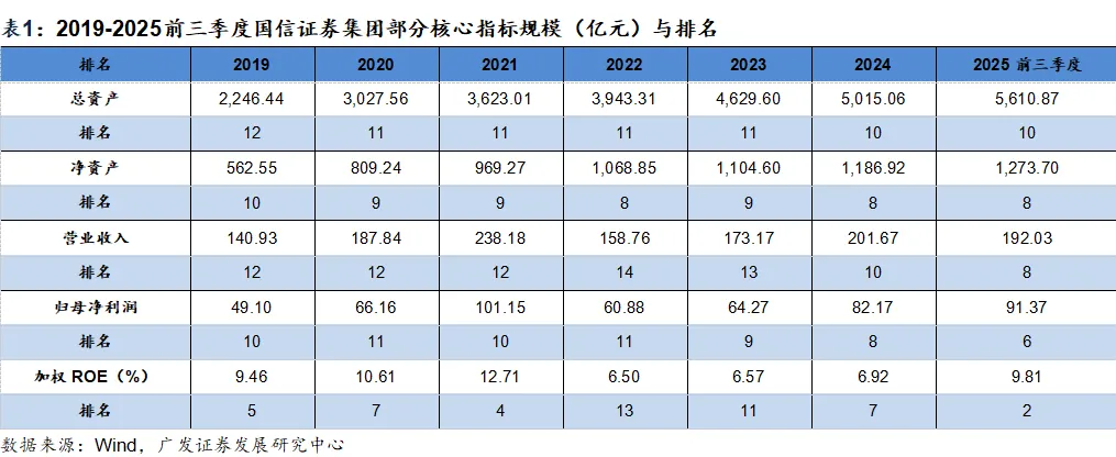 国信证券通过周期适配的稳健经营策略,实现了规模扩张与盈利质量的协同提升,行业地位持续夯实。近十年国信证券总资产排名逐步抬升至行业十名左右,净资产排名提升并稳定在八名左右,资本实力稳步抬升;营业收入与归母净利润在周期波动中展现韧性,2025年前三季度分别排名分别跃升至第8名、第6名;尤其年化加权ROE升至9.81%、行业第2名,凸显盈利效率的领先性,印证其盈利能力与市场地位的双重巩固。